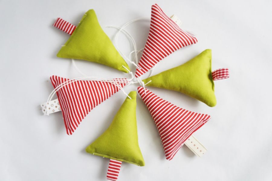 Zestaw 6 choinek uszytych z bawełny, wypełnionych mięciutkim wypełnieniem poliestrowym. Pieniek z rypsowej wstążki, zawieszka z lnianego sznurka.