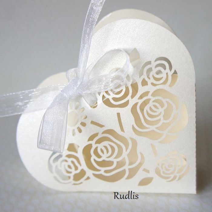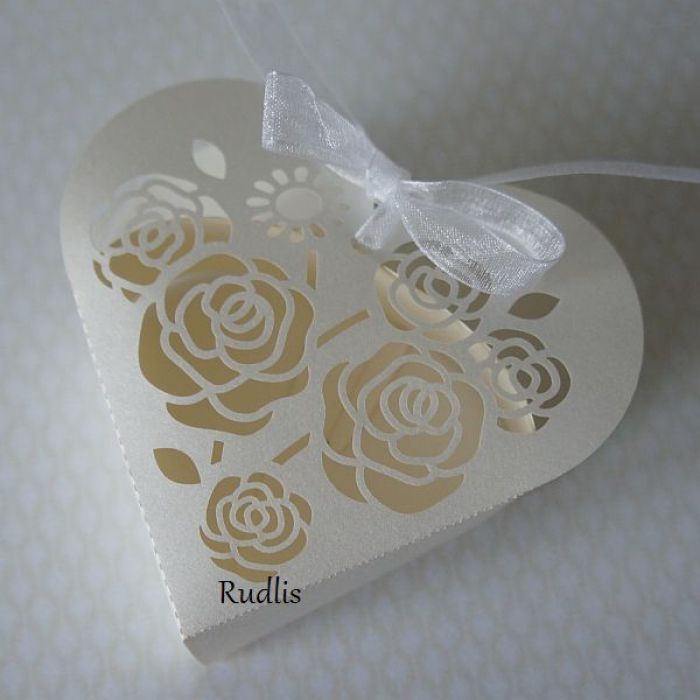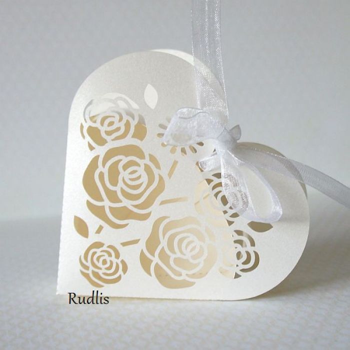 Pudełko w kształcie serca z wyciętym motywem róż, z jednej strony pudełka, druga strona bez wycięć.