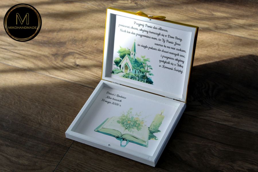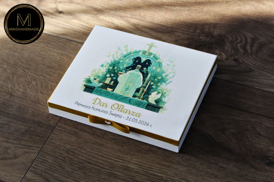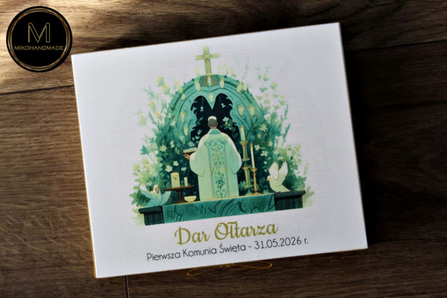 Uwiecznij ten wyjątkowy dzień w życiu dzieci dzięki wyjątkowemu, ręcznie przygotowywanemu pudełku na Dar Ołtarza. To nie tylko praktyczne opakowanie, ale przede wszystkim pamiątka pełna symboliki i osobistego przesłania, która na zawsze pozostanie w sercach obdarowanych – zwłaszcza Księdza, który tego dnia przyjmuje ofiarę na Kościół, dar serc dzieci i rodziców.