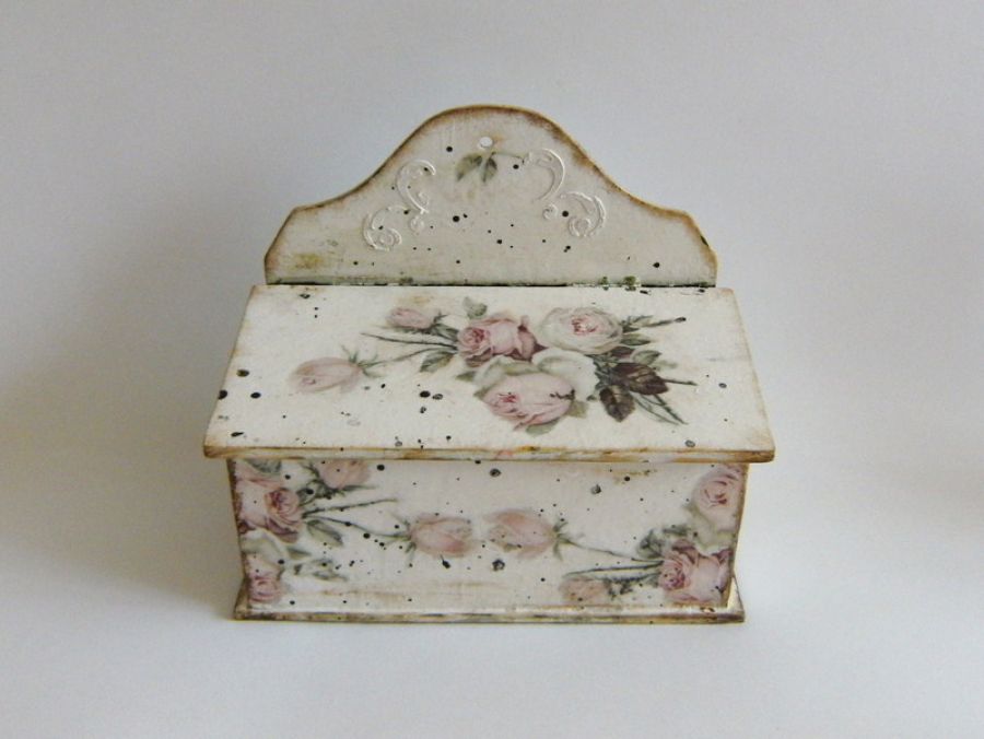 Drugie życie pudełka na herbatę. Malowane farbami akrylowymi, postarzane i lakierowane.Zdobione metodę decoupage. Wnętrze pudełka bejcowane w kolorze ciemnej zieleni.