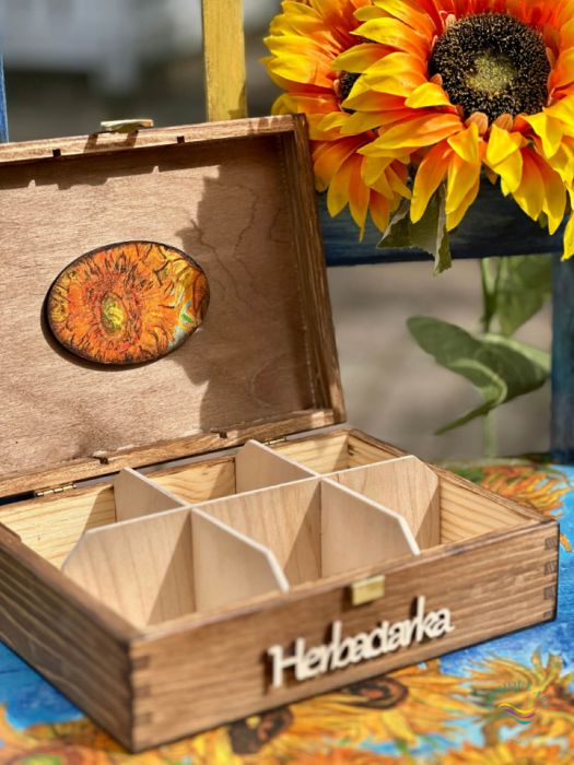 Zadaj pytanie dotyczące produktu: Pudełko na herbatę, motyw słoneczników, prezent dla miłośnika sztuki