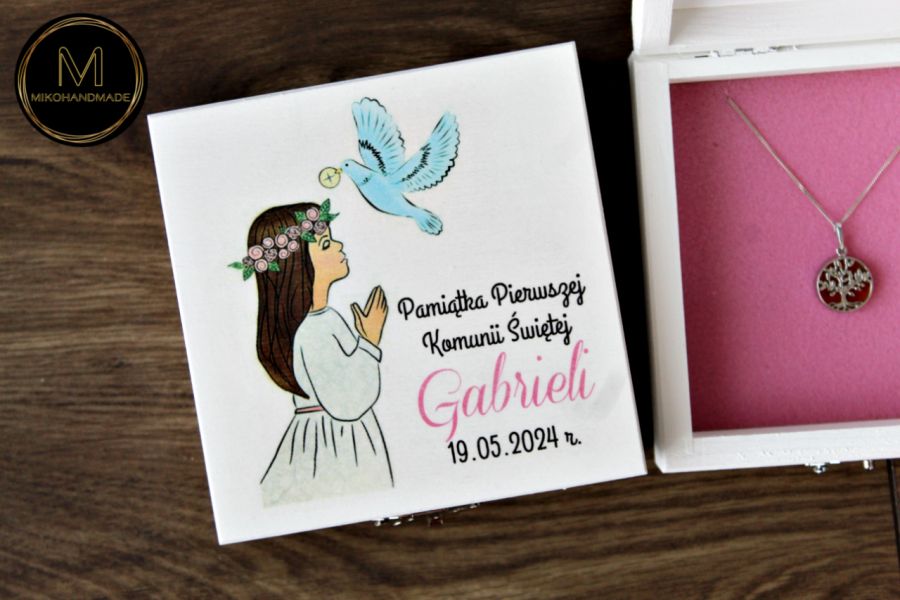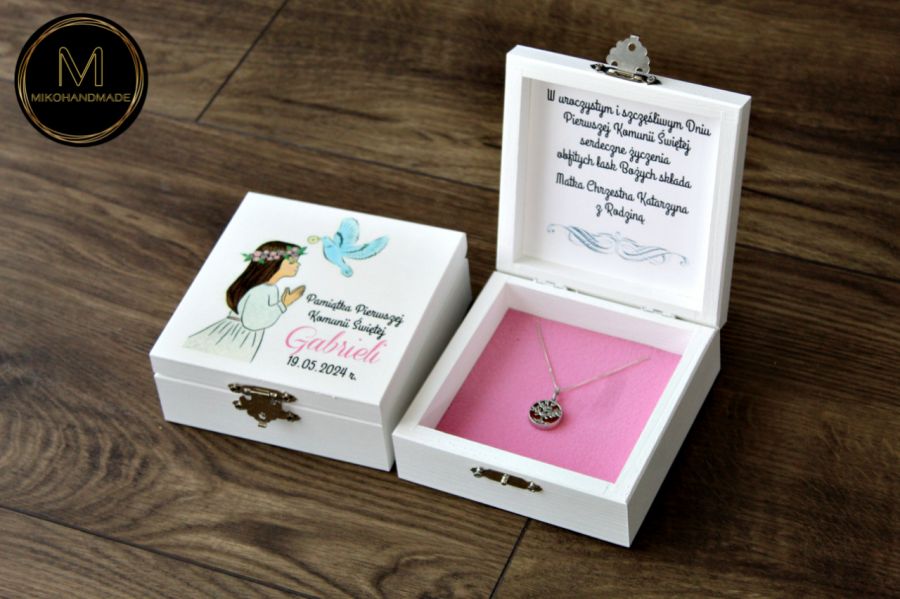 Szukasz wyjątkowego i eleganckiego opakowania na prezent komunijny? To personalizowane pudełeczko zostało stworzone z myślą o wyjątkowym dniu, jakim jest Pierwsza Komunia Święta. Idealnie sprawdzi się jako opakowanie na złoty lub srebrny łańcuszek.