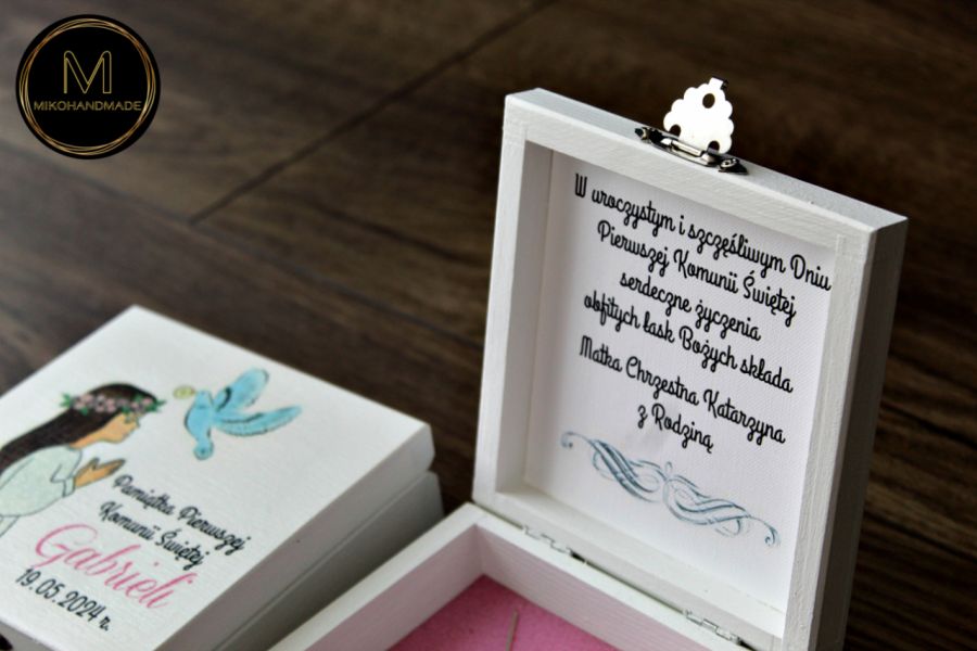 Ponieważ łączy w sobie funkcję praktyczną i sentymentalną. Po rozpakowaniu prezentu, pudełko z imieniem solenizantki i datą komunii może być przechowywane przez lata jako piękna pamiątka tego doniosłego dnia.