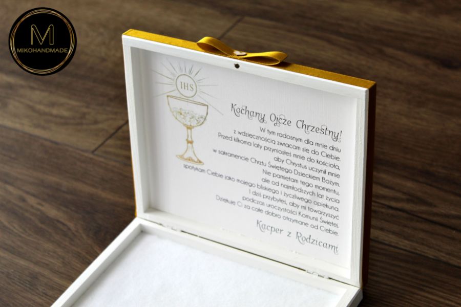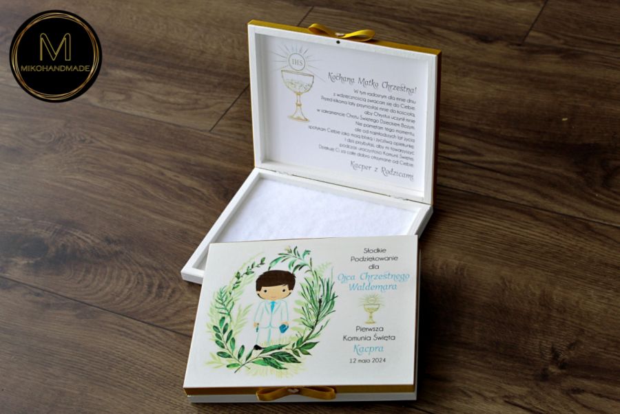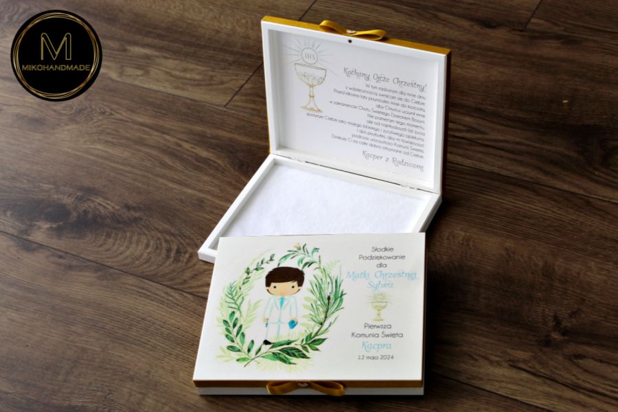 Eleganckie, ręcznie wykonane pudełko prezentowe zaprojektowane z myślą o wyjątkowych chwilach, jaką jest Pierwsza Komunia Święta. Produkt idealnie mieści standardowe opakowanie czekoladek Merci, stanowiąc piękną i praktyczną formę osobistego podziękowania dla Rodziców Chrzestnych lub Dziadków.