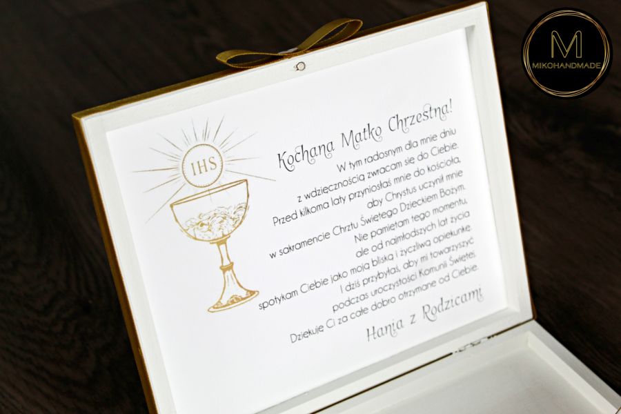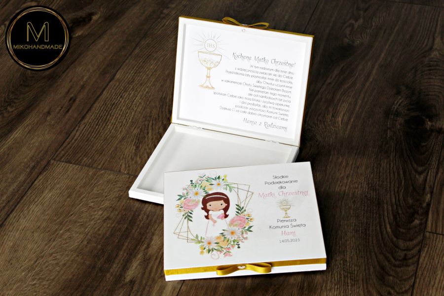 Eleganckie, ręcznie wykonane pudełko prezentowe zaprojektowane z myślą o wyjątkowych chwilach, jaką jest Pierwsza Komunia Święta. Produkt idealnie mieści standardowe opakowanie czekoladek Merci, stanowiąc piękną i praktyczną formę osobistego podziękowania dla Rodziców Chrzestnych lub Dziadków.