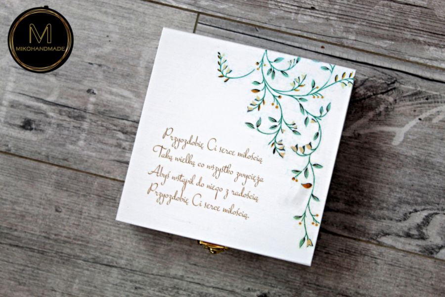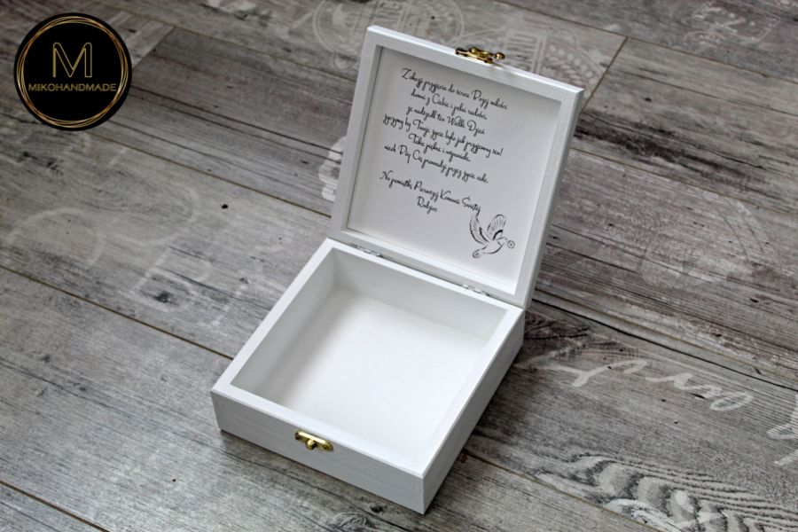 - Dowolny napis na wieku pudełka: można wybrać tradycyjne „IHS”, cytat religijny, imię dziecka, datę lub własną sentencję.