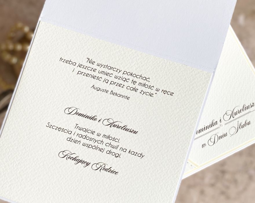 Zestawy ślubne z kolekcja Wedding Charm to klasyczne i ponadczasowe połączenie wyjątkowego włoskiego papieru w odcieniu delikatnej śmietankowej bieli i matowych wykończeń w kolorze ecru lub złotym. Z dodatkiem ręcznie wyciętych elementów, alabastrowych perełek lub delikatnych cyrkonii.