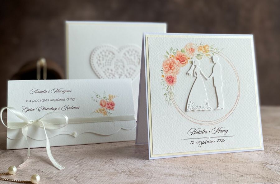 Zestawy ślubne z kolekcja Wedding Charm to klasyczne i ponadczasowe połączenie wyjątkowego włoskiego papieru w odcieniu delikatnej śmietankowej bieli i matowych wykończeń w kolorze ecru lub złotym. Z dodatkiem ręcznie wyciętych elementów, alabastrowych perełek lub delikatnych cyrkonii.