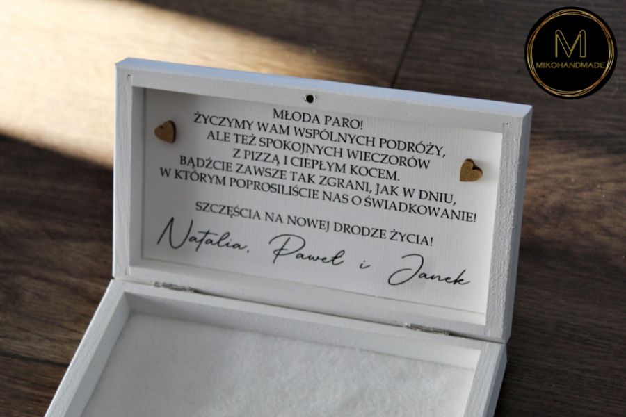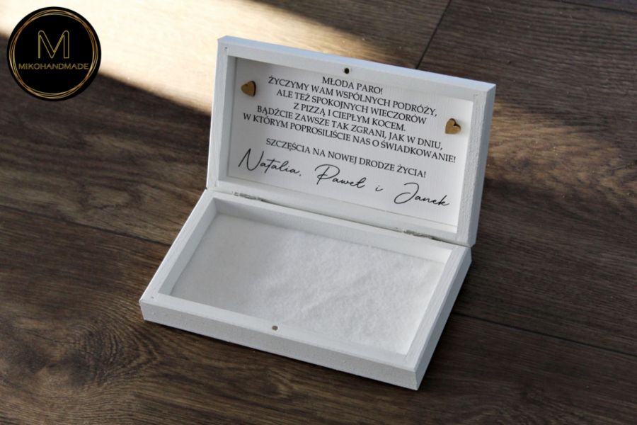 Szukasz wyjątkowego pomysłu na prezent ślubny, który zastąpi tradycyjną kartkę? To drewniane pudełko łączy w sobie elegancję, osobisty charakter i funkcjonalność – stanie się nie tylko oryginalną formą wręczenia gotówki, ale również piękną pamiątką na lata.