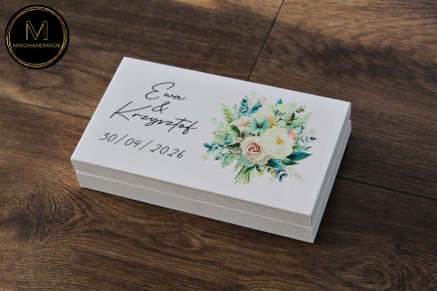 Pudełko zostało ręcznie pomalowane na biało, a jego wieko zdobi delikatny, ręcznie naniesiony wzór bukietu ślubnego – idealnie wpisującego się w klimat weselnych kwiatów Pary Młodej. Na wieku znajdują się także imiona nowożeńców oraz data ślubu, co nadaje prezentowi wyjątkowy, spersonalizowany charakter.