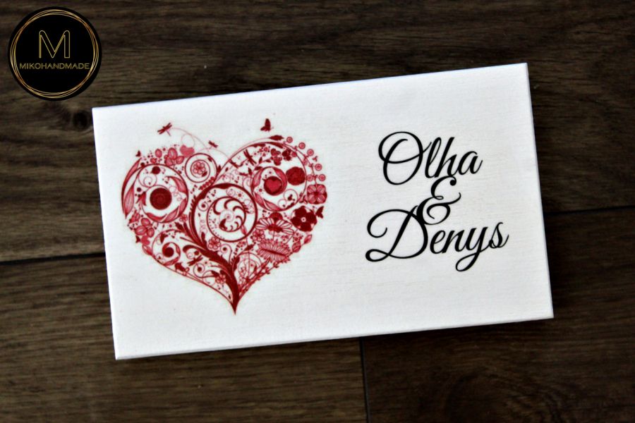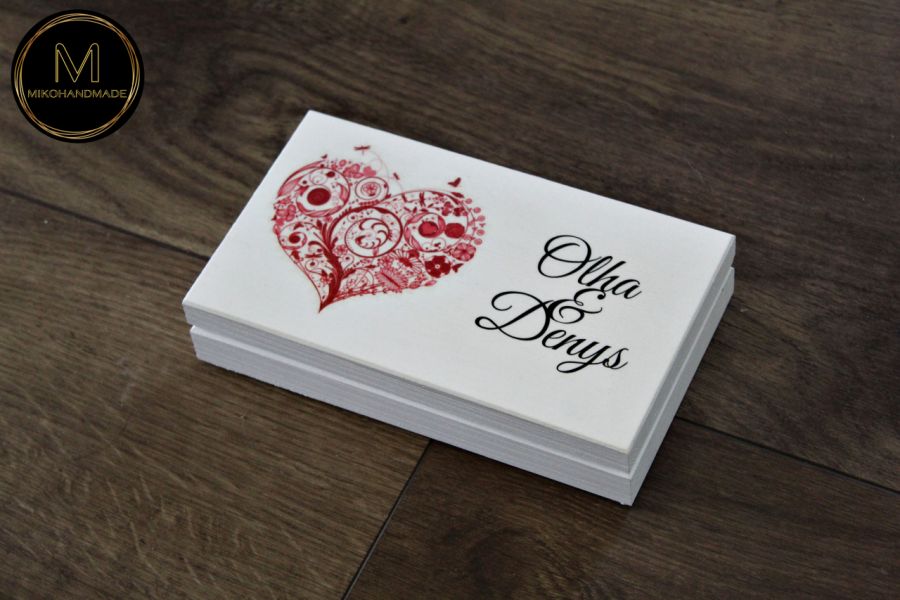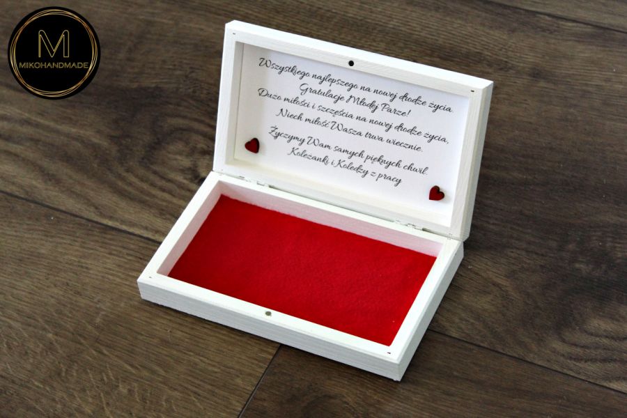 Pudełko zostało wykonane z dbałością o najmniejsze detale. Jego ozdobą jest motyw czerwonego serca – uniwersalny symbol miłości oraz imiona Pary Młodej, co czyni je niepowtarzalną pamiątką na długie lata.