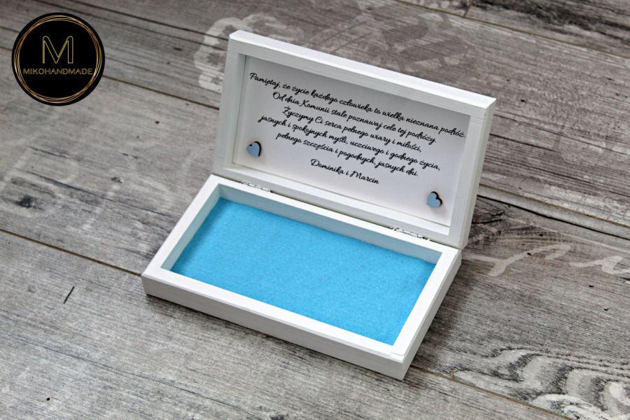 Wnętrze pudełka skrywa nie tylko miejsce na banknoty, ale także piękną niespodziankę. Pod wiekiem znajduje się miejsce na życzenia od bliskich. Całość zdobią dwa małe serduszka pomalowane na delikatny błękitny kolor, symbolizujące czystość i dziecięcą niewinność. Dno pudełka zostało wyłożone miękkim, błękitnym filcem, który dodaje całości szlachetności i chroni zawartość.