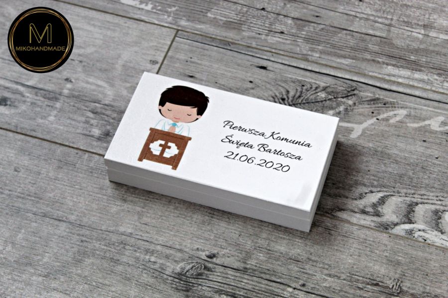 Pudełko zostało wykonane z drewna i pomalowane na biało, co nadaje mu lekkości i podkreśla uroczysty charakter wydarzenia. Wieko zdobi ręcznie naniesiony motyw chłopca klęczącego w ławce kościelnej – symboliczna scena oddająca ducha tego wyjątkowego dnia. Dodatkowo, produkt jest w pełni personalizowany – na wieku umieszczamy imię dziecka oraz datę Komunii Świętej, co czyni go niepowtarzalną pamiątką na długie lata.