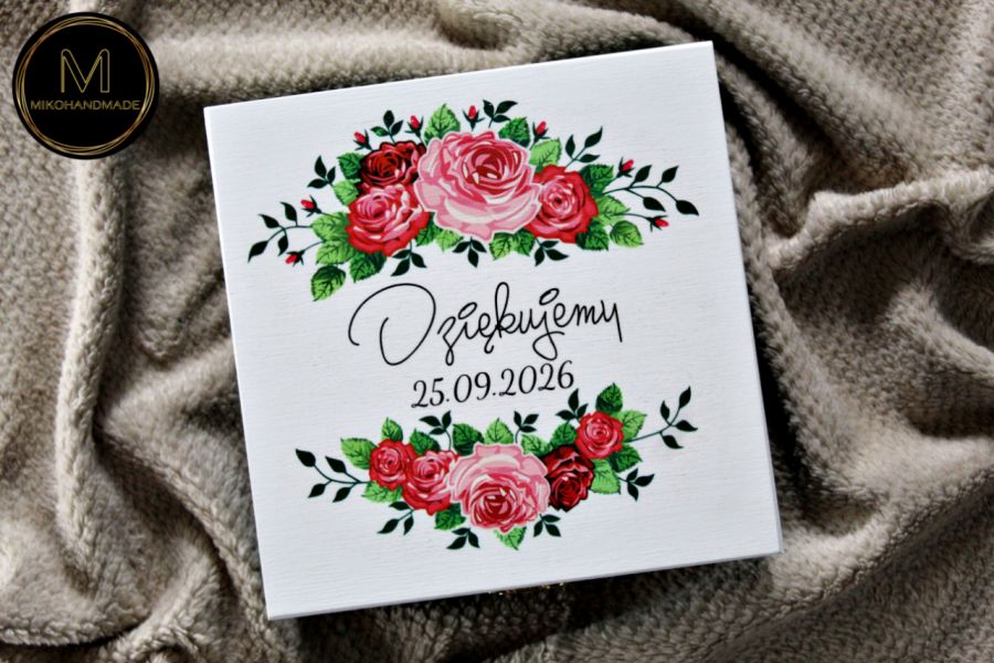 - Zdobienie wieka: ręcznie naniesiony wzór różowych róż oraz personalizowany napis według wskazań klienta (imię, rola, data lub dowolna dedykacja).