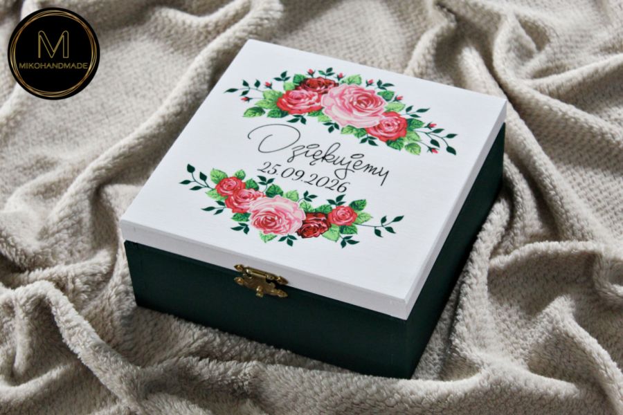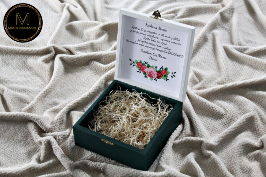 Personalizowany, ręcznie wykonany przedmiot, który po wręczeniu może służyć jako dekoracyjne pudełko na biżuterię, listy, pamiątki lub drobiazgi.