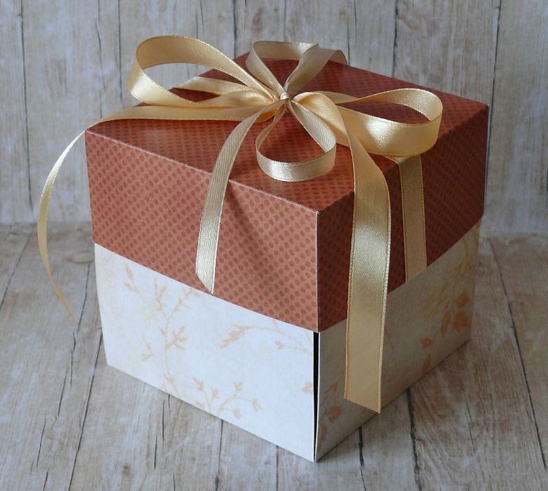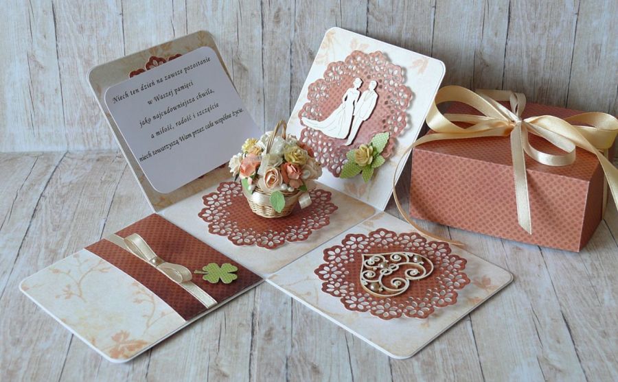 Elegancka kartka z okazji ślubu w formie oryginalnego pudełka w beżowo-brązowej kolorystyce: