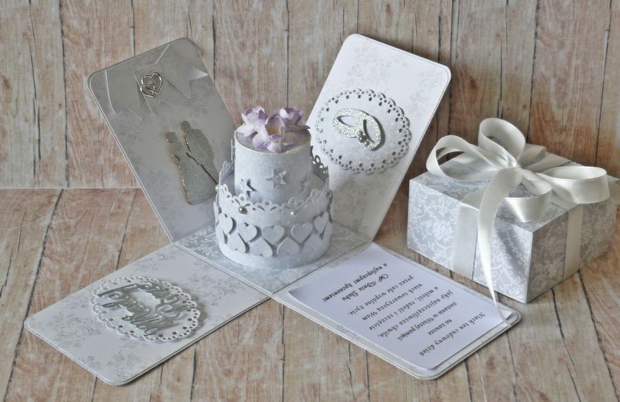 Elegancka kartka z okazji ślubu w formie oryginalnego pudełka w biało-szaro-srebrnej kolorystyce: