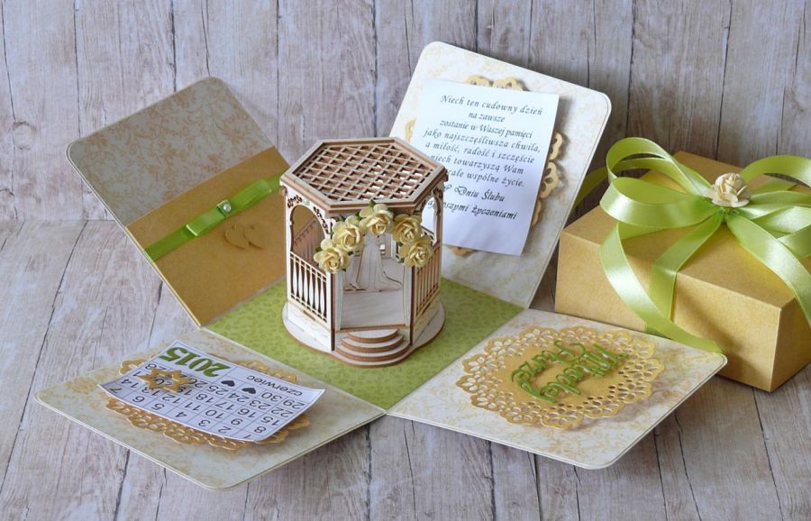 - wewnątrz pudełeczka tekturowa altanka z młodą parą.