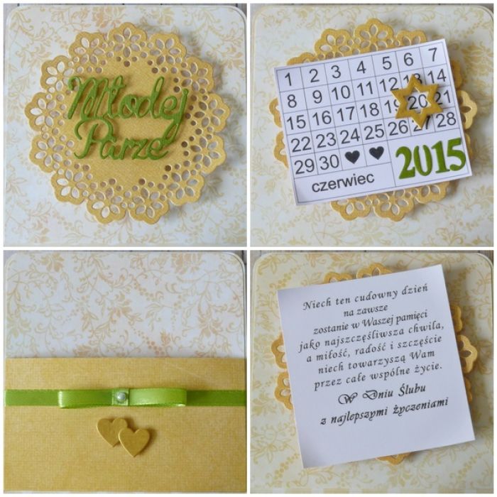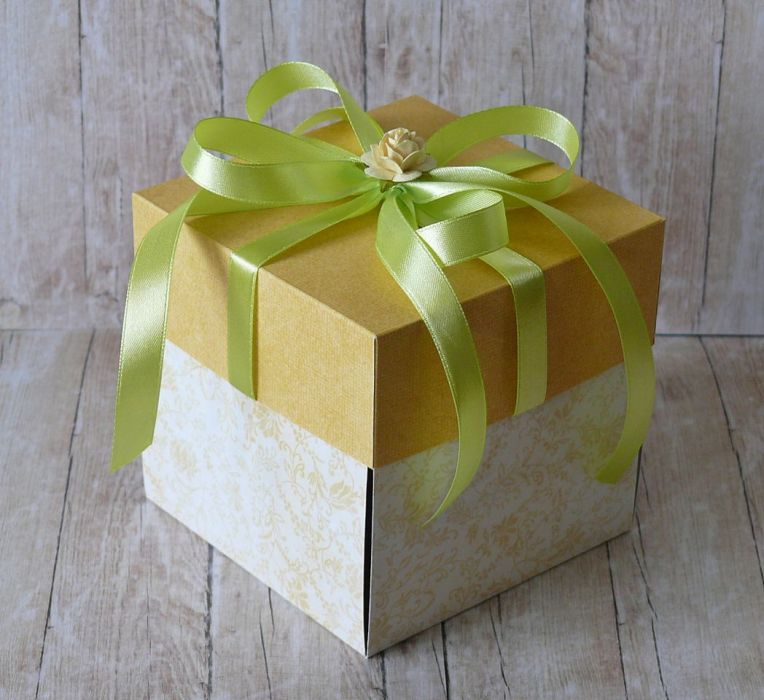 Elegancka kartka z okazji ślubu w formie oryginalnego pudełka w żółtej kolorystyce z zielonymi dodatkami: