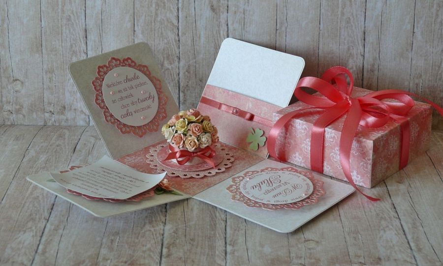 Pudełeczko z życzeniami śliczne, perfekcyjnie wykonane, ze smakiem dobrana kolorystyka, elementy wewnątrz ładnie i pomysłowo rozmieszczone. Szybka realizacja zamówienia, polecam.