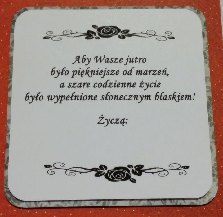 Bardzo dziękuję za przesyłkę. Zamówienie zrealizowano szybko i bardzo profesjonalnie. Pudełko z życzeniami prześliczne. Starannie wykonane z duża dbałością o szczegóły. Jeszcze raz dziękuję, pozdrawiam i POLECAM :)