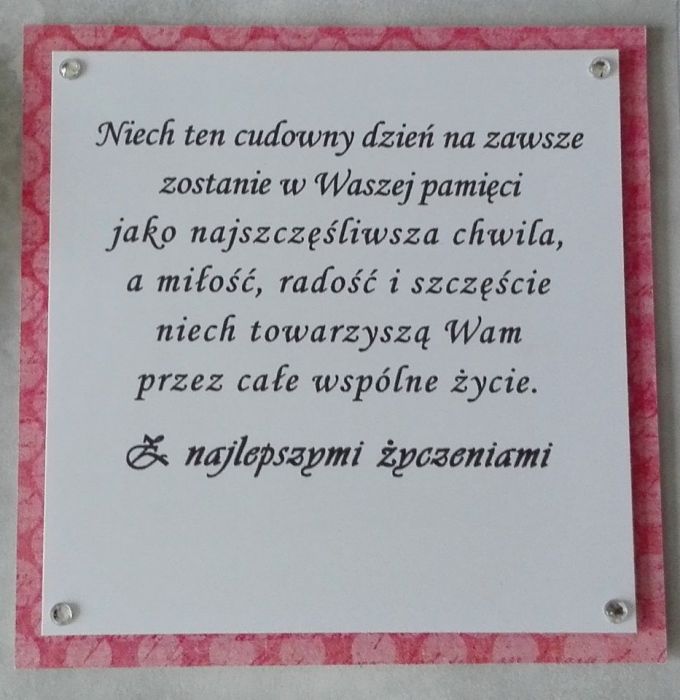 Bardzo dziękuję za przesyłkę. Zamówienie zrealizowano szybko i bardzo profesjonalnie. Pudełko z życzeniami prześliczne. Starannie wykonane z duża dbałością o szczegóły. Jeszcze raz dziękuję, pozdrawiam i POLECAM :)