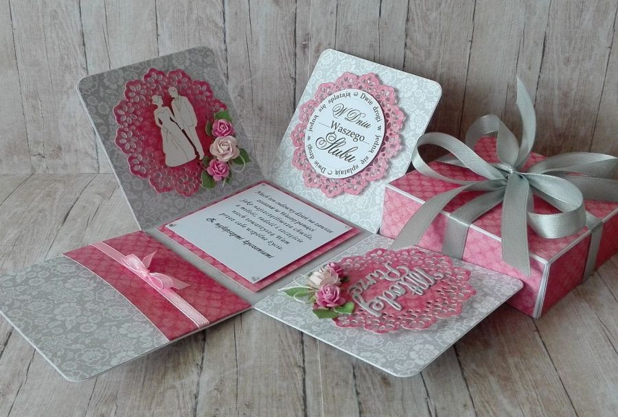 Elegancka kartka z okazji ślubu w formie oryginalnego pudełka w szaro-różowej kolorystyce: