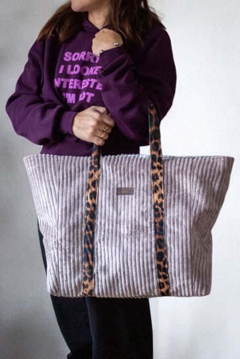 Duża torba typu shopperka w kolorze pudroworóżowym wykonana z grubego sztruksu. Pasy z weluru w panterkę.