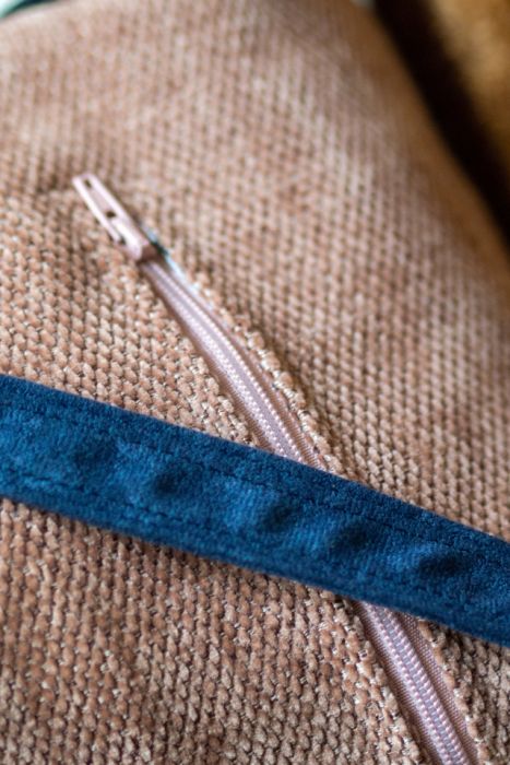 Średniej wielkości torebka w stylu boho. Worek zapinany na suwak z okrągłym, usztywnianym dnem wykonany z różowej plecionej tkaniny oraz turkusowego weluru. Granatowe paski.