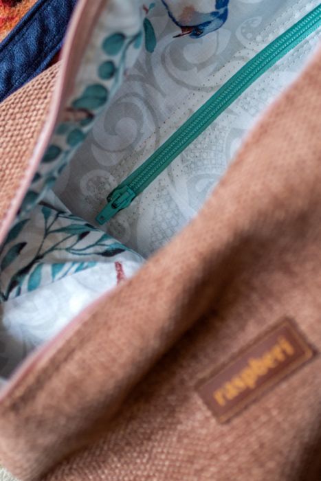 Torebka w środku oraz z tyłu posiada kieszonki zapinane na suwak. Biała, bawełniana podszewka w kwiatki.