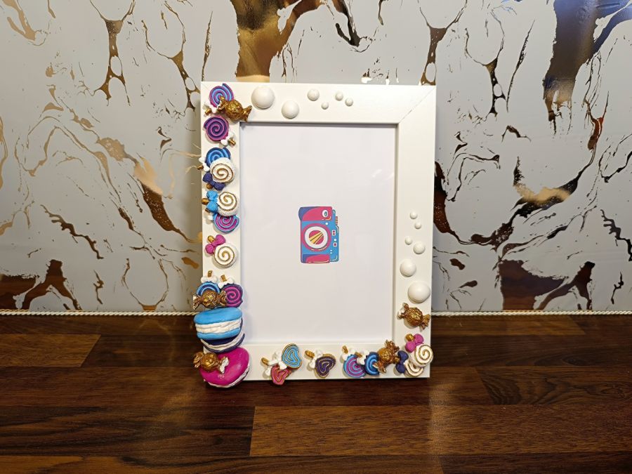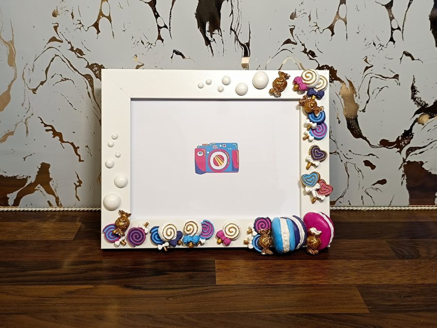 Ta ręcznie robiona ramka na zdjęcia może rozjaśnić każdą przestrzeń swoim urokiem! To świetny sposób, aby pokazać swoją osobowość! Ramka składa się kilkudziesięciu ręcznie malowanych elementów. Cukierki, lizaki i makaroniki.