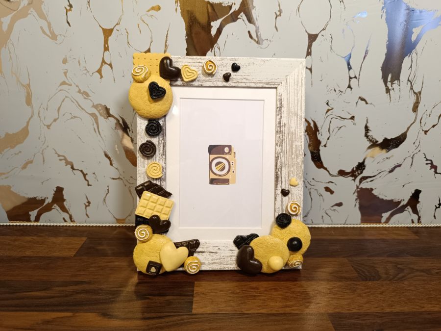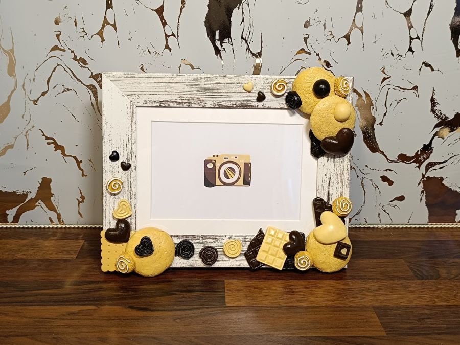 Ta ręcznie robiona ramka na zdjęcia może rozjaśnić każdą przestrzeń swoim urokiem! To świetny sposób, aby pokazać swoją osobowość! Ramka składa się kilkudziesięciu ręcznie malowanych elementów. Herbatniki, ciastka, czekoladki i bułeczki cynamonowe.