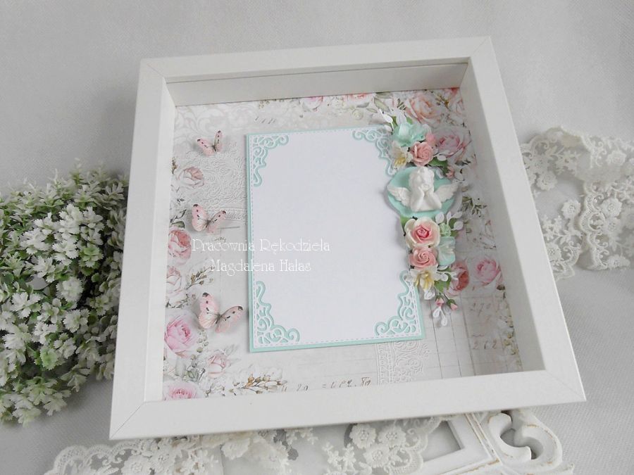 Wewnątrz ramka udekorowana jest pięknymi papierami scrapowymi, białym aniołkiem oraz kwiatami.