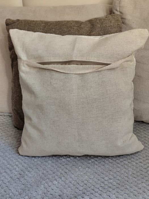 Tył poszewki wykonany z lnu, a boki z tkaniny bawełnianej, ładnego beżu z domieszką lnu, tworząc harmonijne połączenie faktur i materiałów. Całość została starannie zszyta maszynowo, z dbałością o każdy detal.