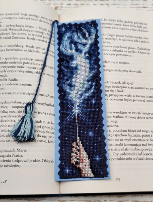 Nazwa produktu: Ręcznie haftowana zakładka do książki z zaklęciem ochronnym Harry’ego Pottera.