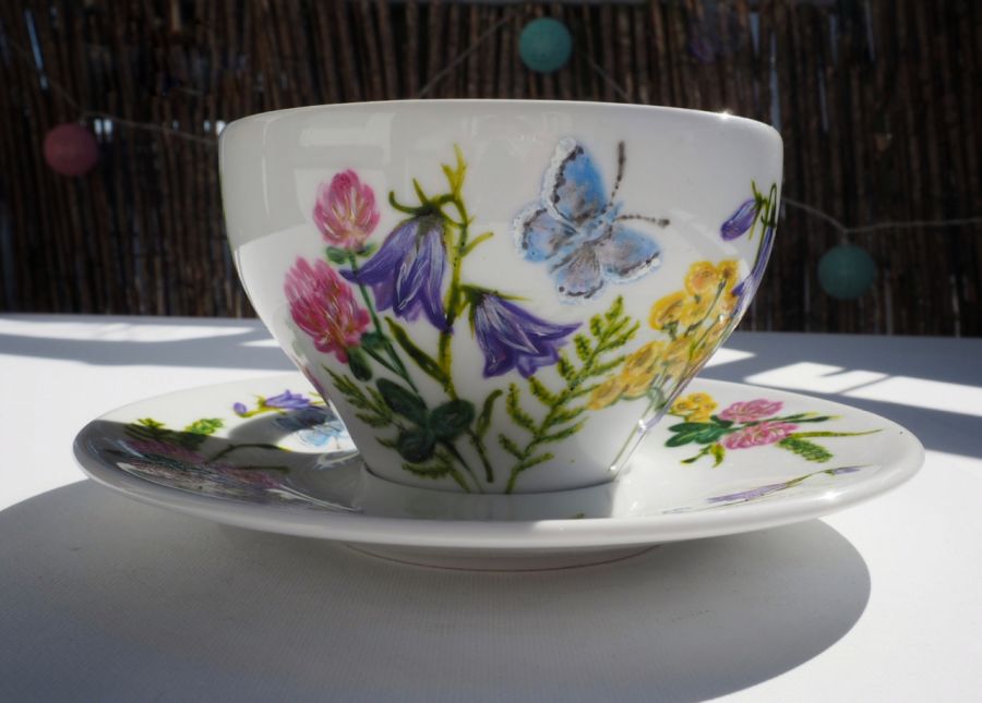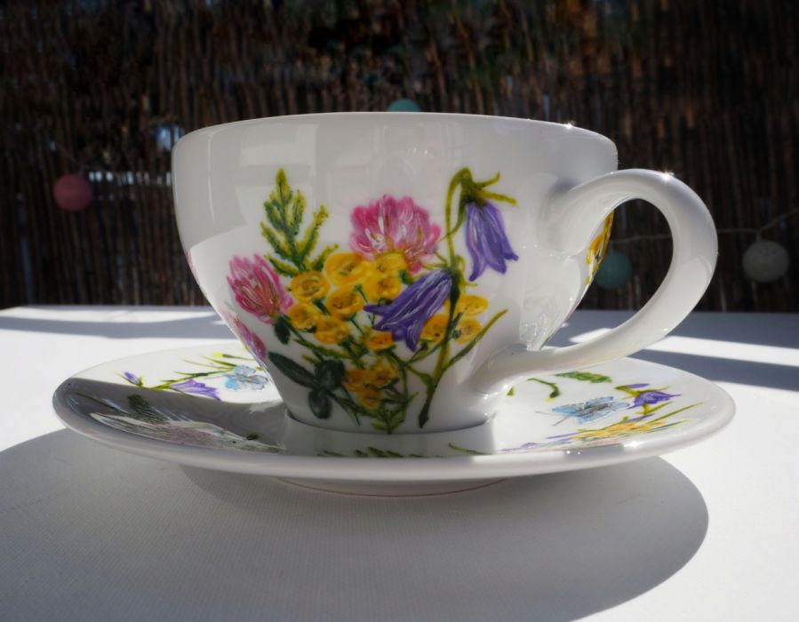 Ręcznie malowany kwiatowy zestaw filiżanka ze spodkiem będzie doskonały, by okazać sympatię wyjątkowej osobie lub wnieść kolor do Twojej kuchni. Aby nadać przedmiotowi osobisty charakter na spodku można umieścić np. imię obdarowanej osoby, datę, ilość lat, krótki napis.
