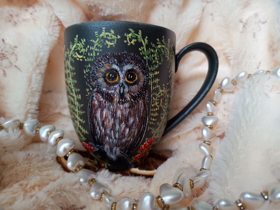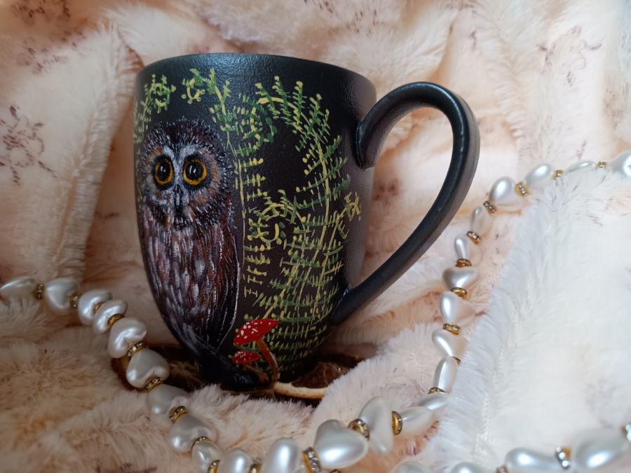 Ręcznie malowany kubek z sówką wsród runa leśnego.