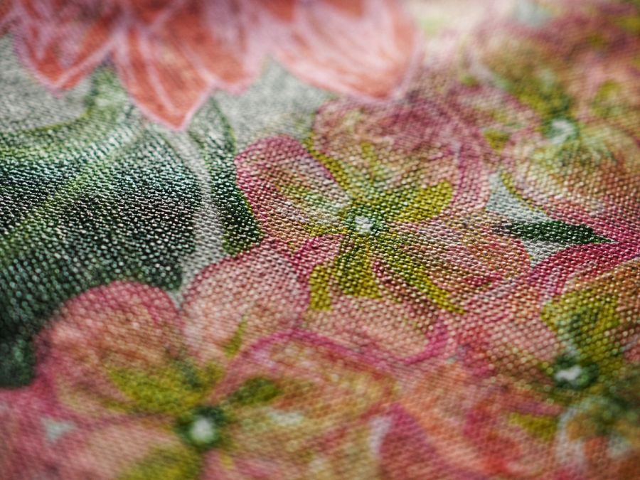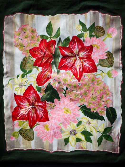 Ręcznie malowana (nie drukowana) tekstylna torba bawełniana z egzotycznym motywem kwiatowym. Torba na zakupy z uchwytami o długości 66 cm.