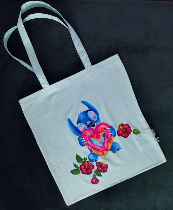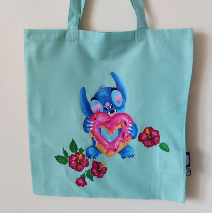 Inspirowana filmem Disneya "Lilo i Stich" ręcznie malowana bawełniana torba zakupowa na ramię, doskonała również dla dziecka jako torba na strój gimnastyczny, artykuły plastyczne do szkoły, strój na basen czy nocowanie u koleżanki.