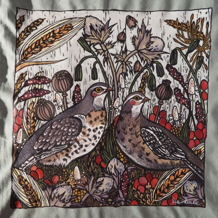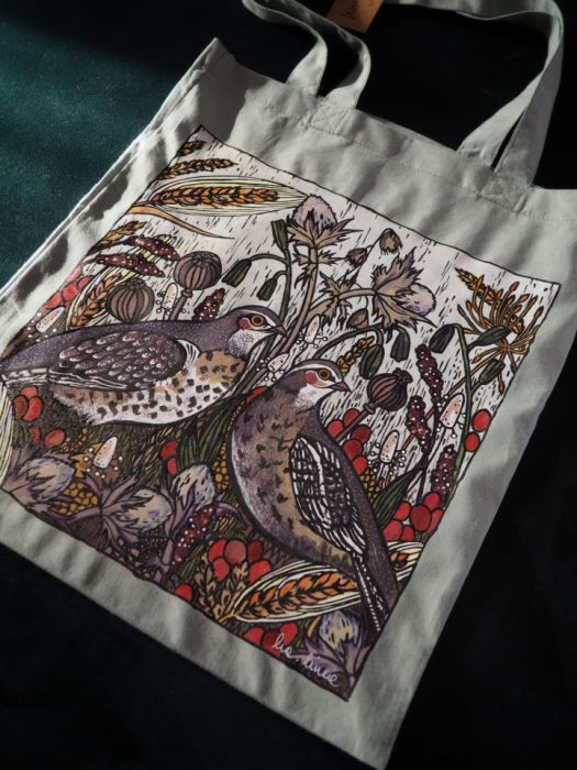 Ręcznie malowana bawełniana torba zakupowa z wzorem kuropatw na polu. Będzie doskonałym uzupełnieniem stroju lub prezentem imieninowym, urodzinowym, gwiazdkowym itp. dla osoby ceniącej rękodzieło. Torba będzie idealna do pracy, na spacer po mieście, do szkoły - zmieści teczkę z dokumentami, drugie śniadanie, wodę, telefon, portfel itd. Ciekawy wzór przyciągnie spojrzenia wokół. Sprawdzi się zarówno na co dzień, jak i na wakacyjny wyjazd. Wzór na torbie jest trwały i wodoodporny - torbę można wyprać ręcznie w temp. do 30 stopni (nie wykręcać, nie wirować - powiesić z wodą do odcieknięcia. Można prasować po lewej stronie).