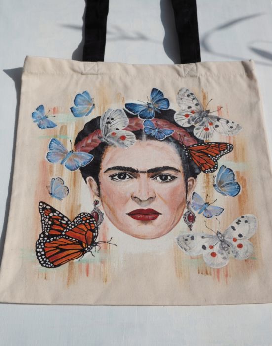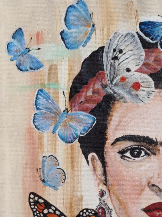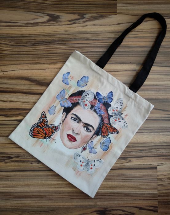 Ręcznie malowana (nie drukowana) bawełniana torba z wizerunkiem Fridy Kahlo. Torba na zakupy z uchwytami o długości 62 cm (2 x 31cm) - znakomita również jako praktyczne uzupełnienie codziennego miejskiego outfitu, pomieści wszelkie drobiazgi potrzebne na wyjście z domu. Świetnej jakości grube płótno (bawełna 100% fair trade) zapewnia trwałość na lata.