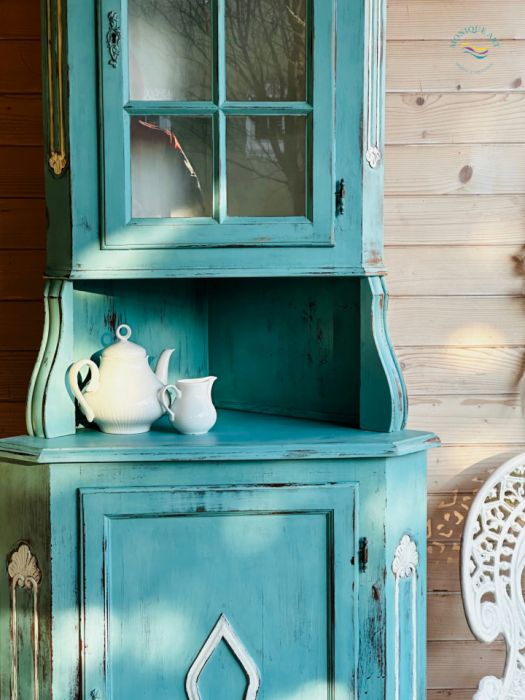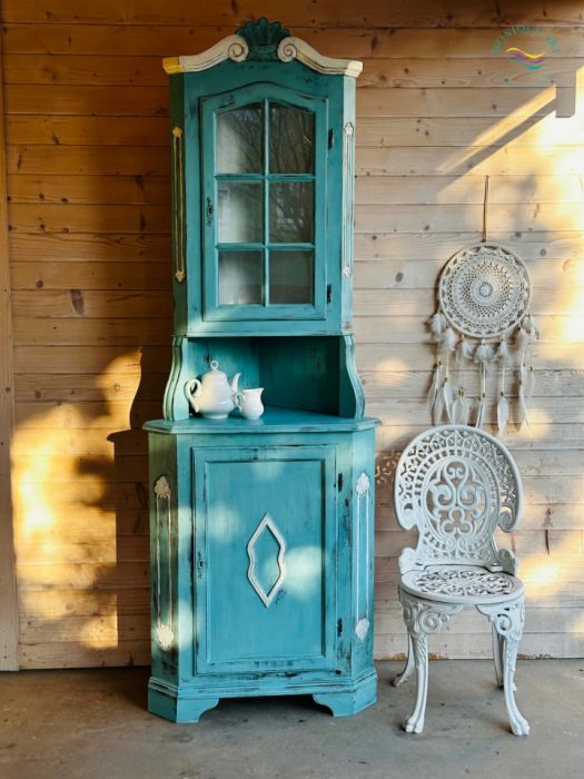 Nazwa produktu: Ręcznie malowana witryna narożna, unikat, zielononiebieski turkus