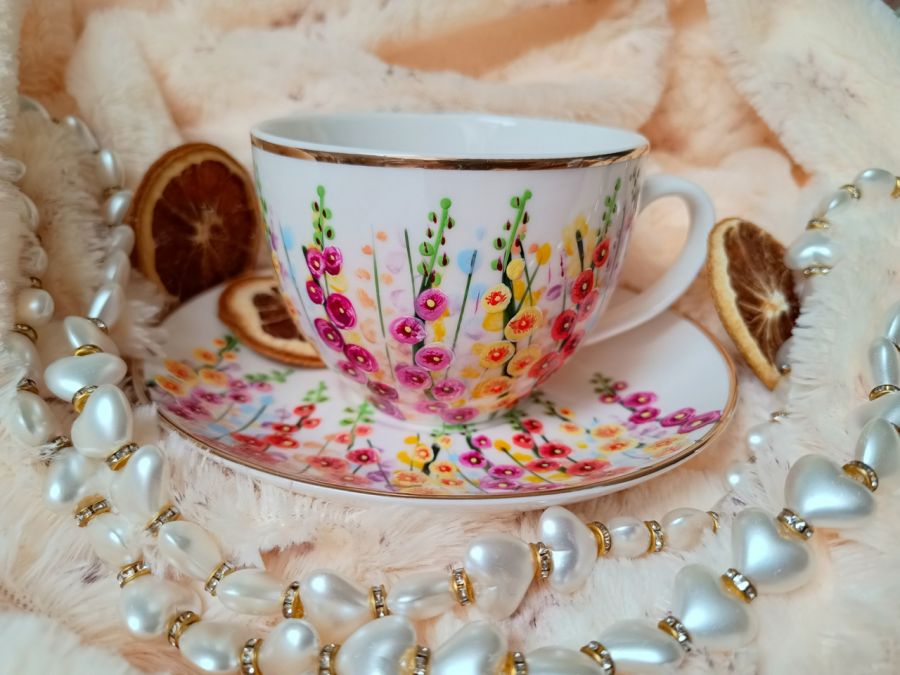 Ręcznie malowany komplet z malwami to przepiękna propozycja dla wrażliwych i delikatnych dusz.