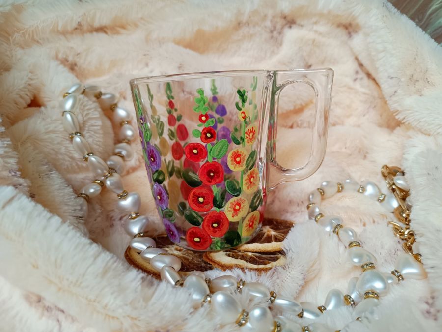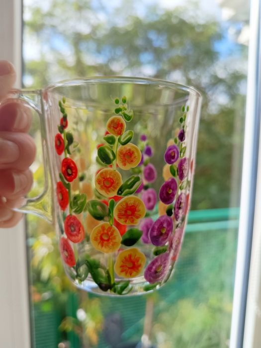 Ręcznie malowana szklanka w malwy. Zatrzymać lato jego kolory, barwy, ciepło i słońce na cały rok...