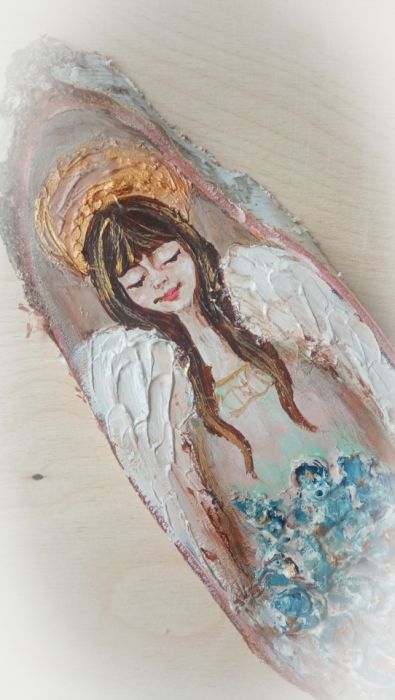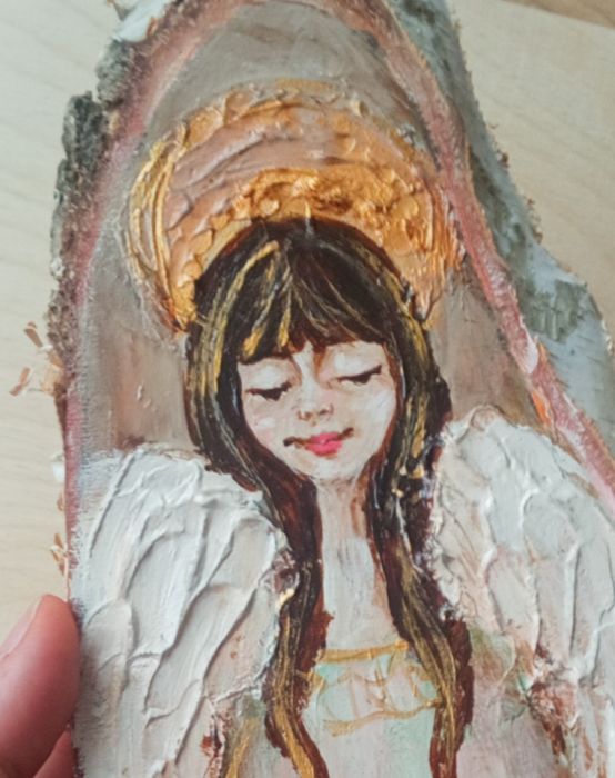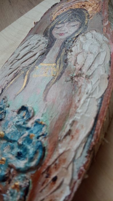 Ręcznie malowany anioł na drewnie z cyklu sielankowych aniołów został namalowany farbami akrylowymi na pięknym, wyszlifowanym plastrze drewna. Utrzymany jest w przyjemnej kolorystyce, która będzie pasować do każdego wnętrza.