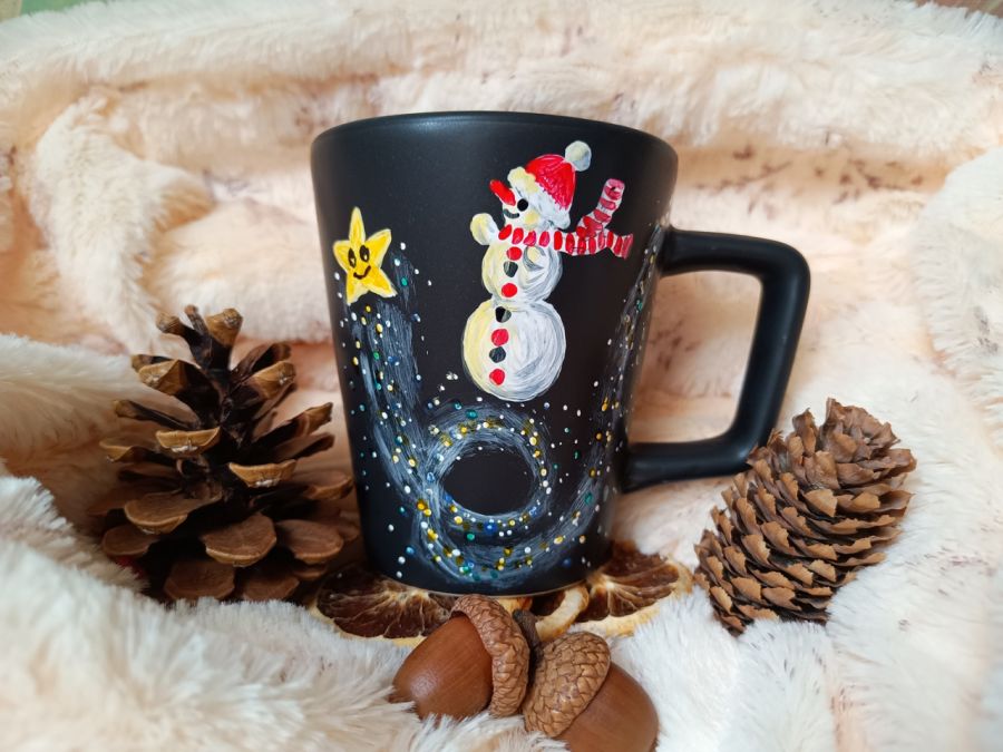 Ręcznie malowany kubek z bałwankiem gwiezdnym pyłem i gwiazdką.