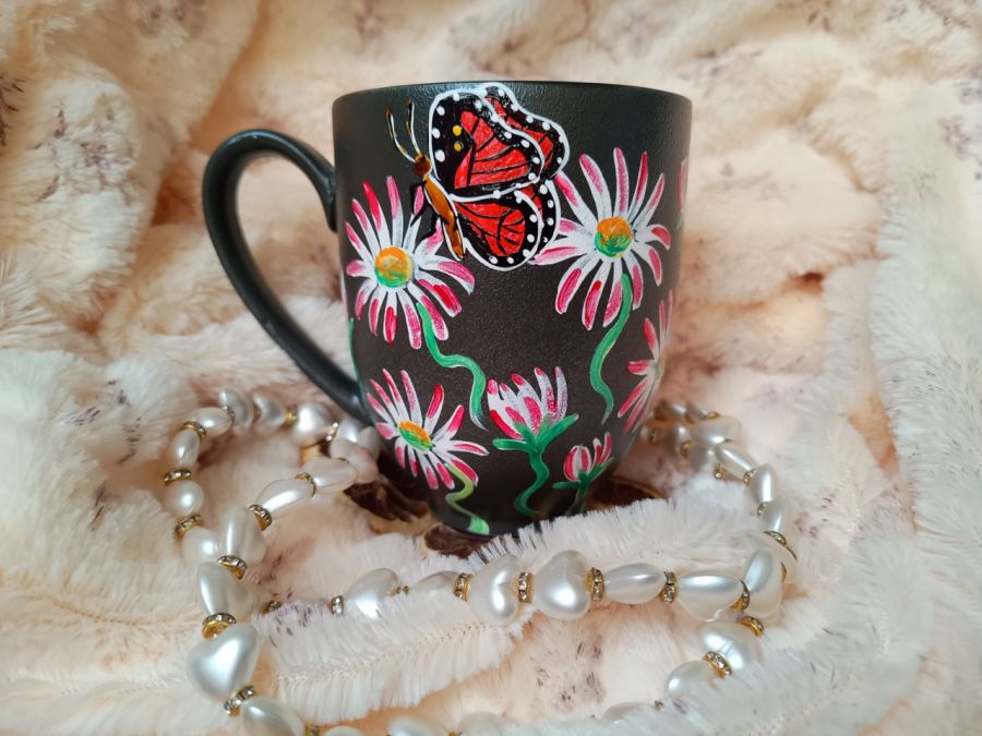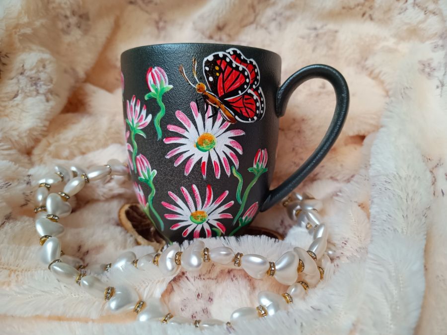 Ręcznie malowany kubek ze stokrotkami i motylkami do ulubionych napojów, kawy i herbaty.