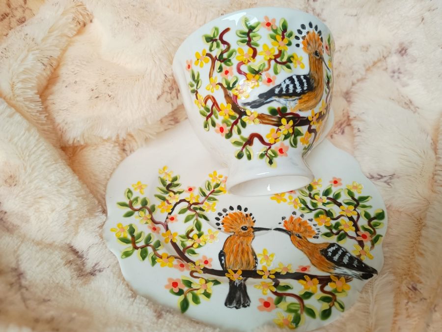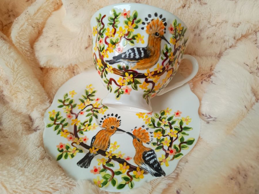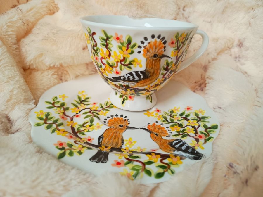Zadaj pytanie dotyczące produktu: Ręcznie malowany komplet. Zakochane dudki filiżanka z talerzykiem