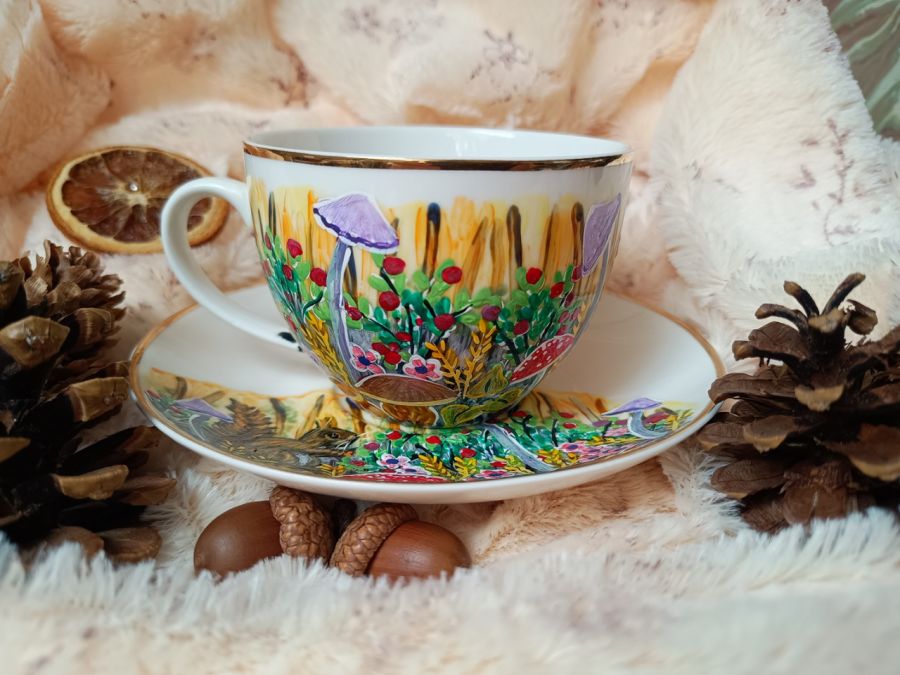 Obrazy i pejzaże to 100 % rękodzieło. Nie używam gotowych pieczątek, obrazy są utwardzone termicznie, zalecane jest mycie tylko i wyłącznie ręczne. Porcelana jest w pełni użytkowa, smacznego! :)