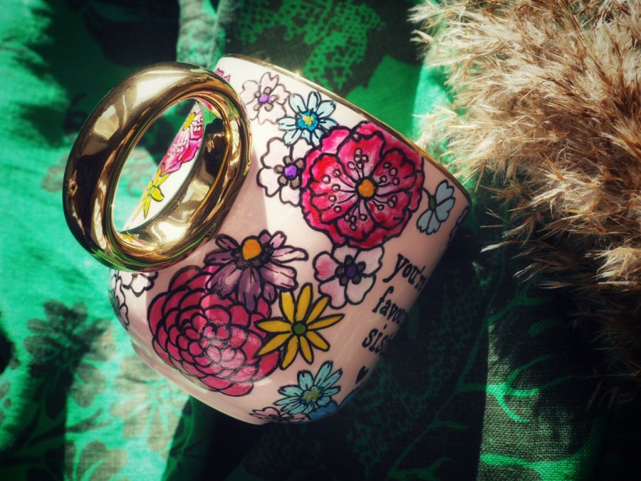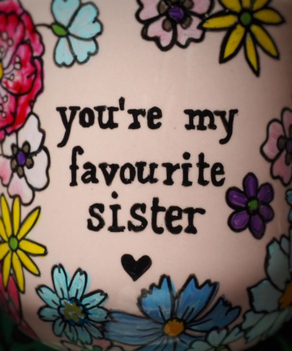 Ręcznie malowany kubek z napisem "You're my favourite sister"" i kolorowym kwiatowym wzorem to doskonały prezent dla siostry lub przyjaciółki, którą traktujesz jak najukochańszą siostrę - "sister from another mister" :)